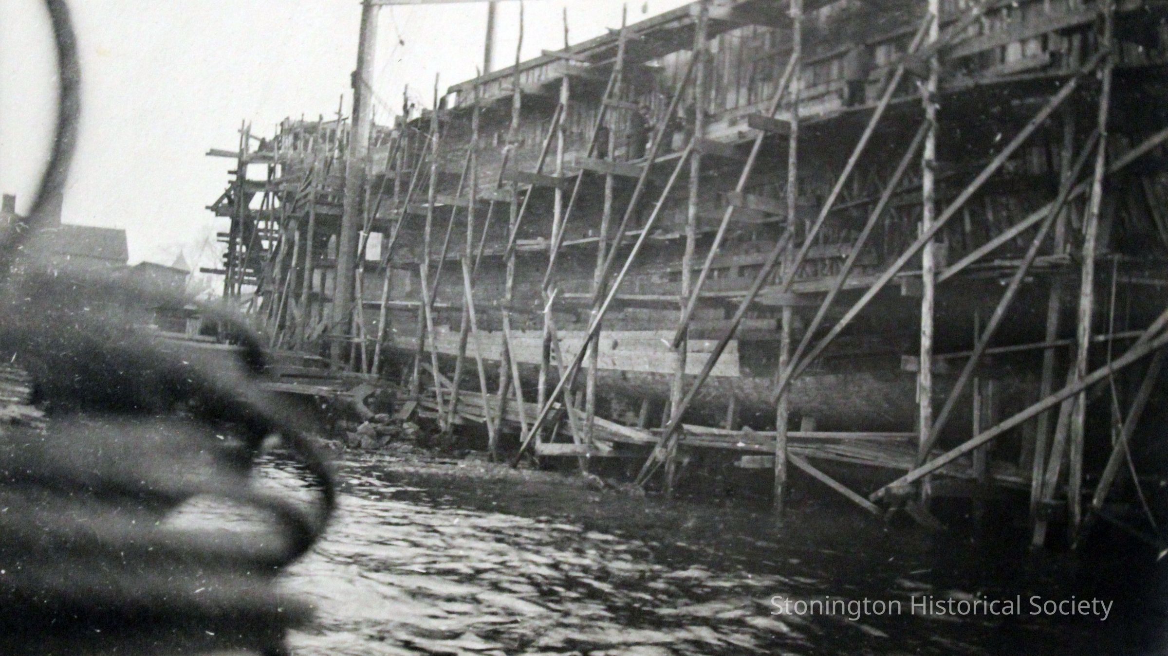 A side view of the SS Lansing at Stonington docks being rebuilt, taken from the water line. Cradles, stops and blocks are visible beneath the ship, as is the scaffolding surrounding the hull. The Lansing steamship was rebuilt by the Ship Construction and Trading Company, Inc. of Stonington for the Nafra Company of New York.Made/Created