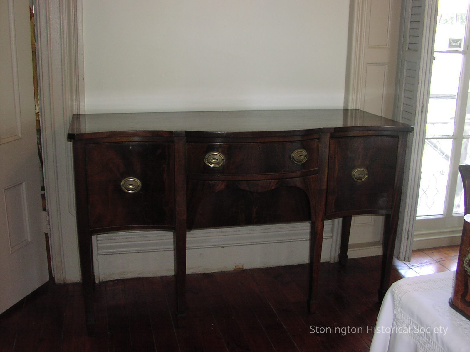 Mahogany veneer sideboard, Sheraton; 6 tapered legs, oval brass pulls. Shallow center drawer, deep drawer on right side of sideboard, left side is cabinet, opens into two shelves. Sepentine curved front.Collection