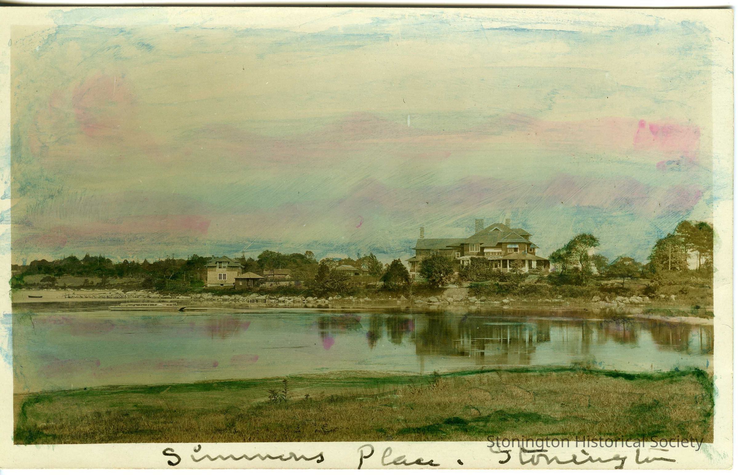 Simmons Place, Stonington CT color postcard with light blue added to it showing house from cove