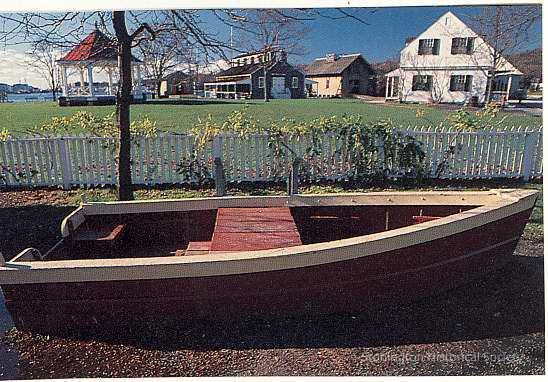 Small row boat in front of green with houses at Mystic Seaport from a calendar.