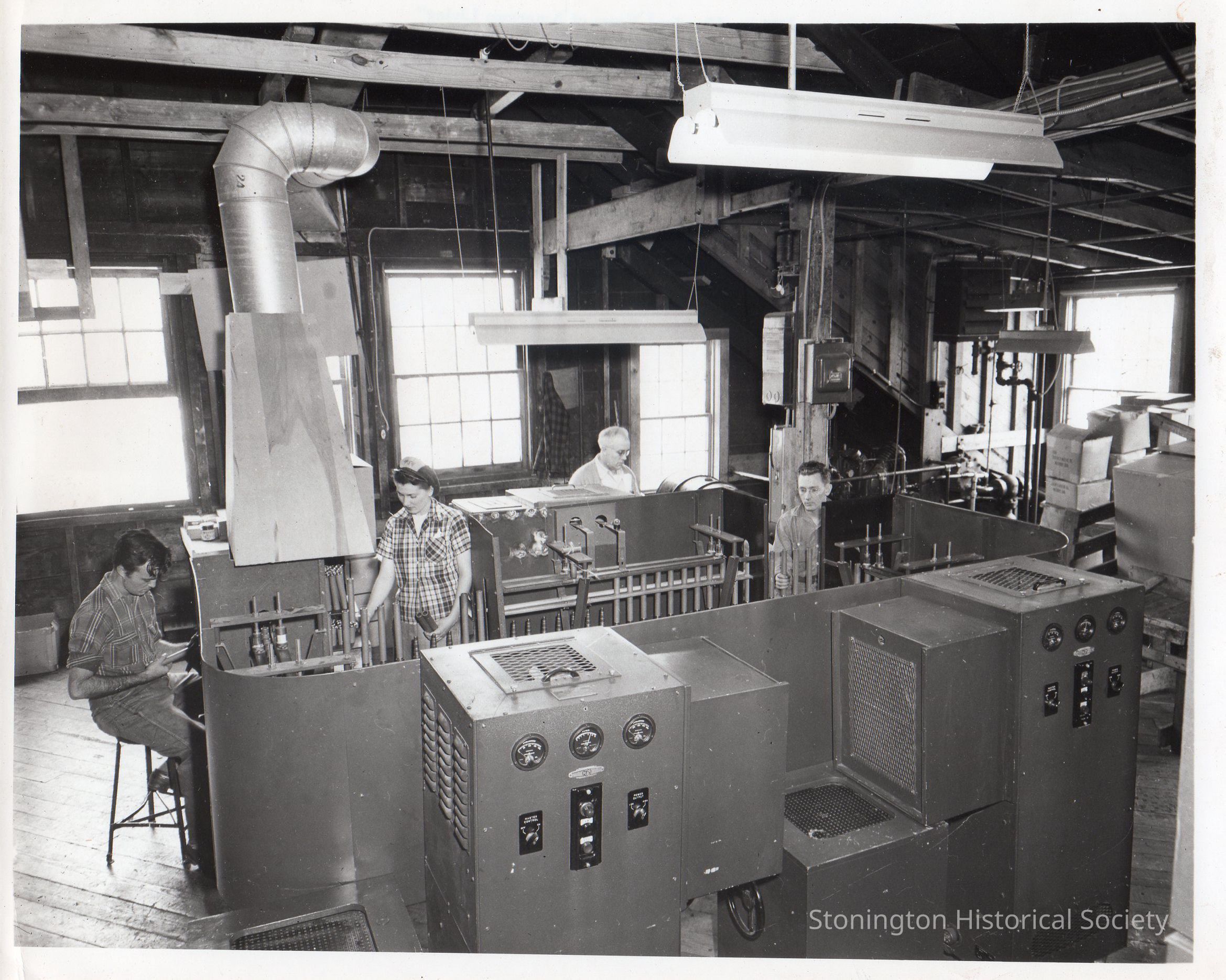 Black and white photograph of employees and machinery at the Sonoco Products Co., formerly located on Willow Street in Mystic. Written on back: "Three Hundred Years of American Living, Stonington Tricentennial, 1649-1949. An electronic unit at Sonoco Products Co., Mystic, used for curing impregnated tips of straight sided winding bobbins."