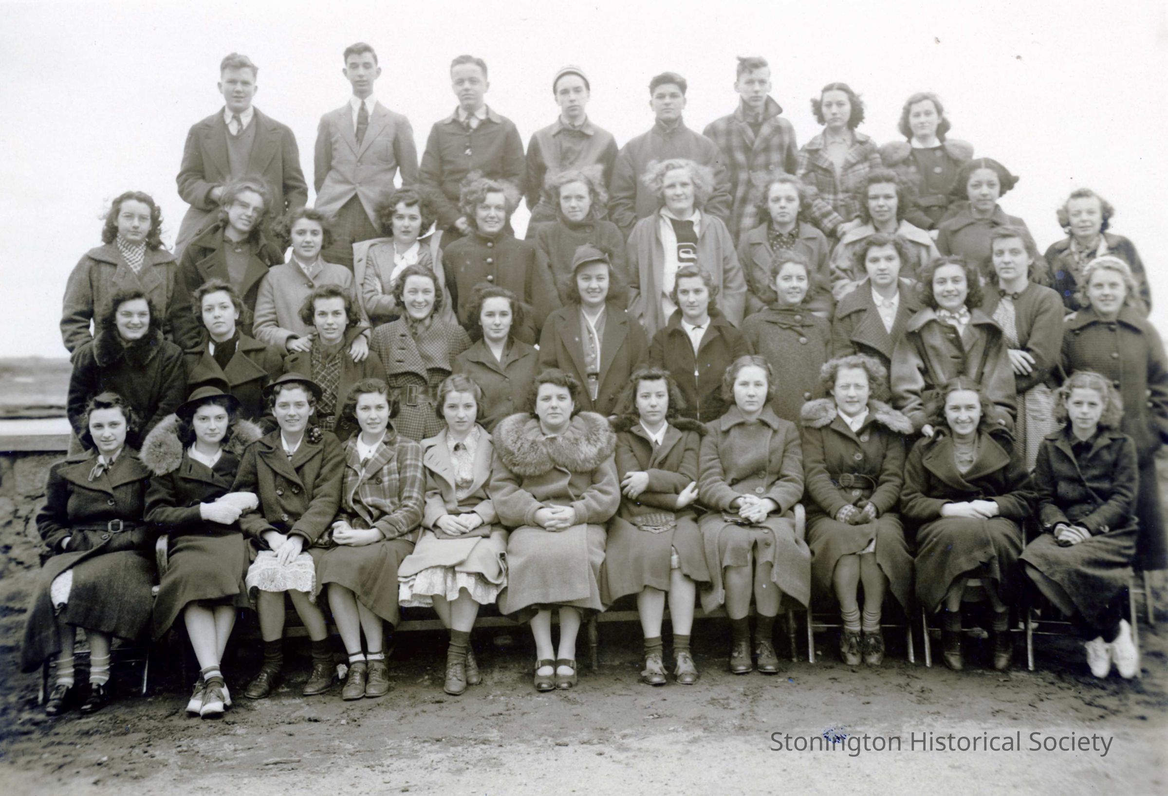 School photograph of the class of 1938 of Souhegan High School. The developer stamp on the back indicates Savoy Studio on West Main Street in Mystic. The donor's mother is furthest on the right, second row from the bottom - Corinne Noyes.