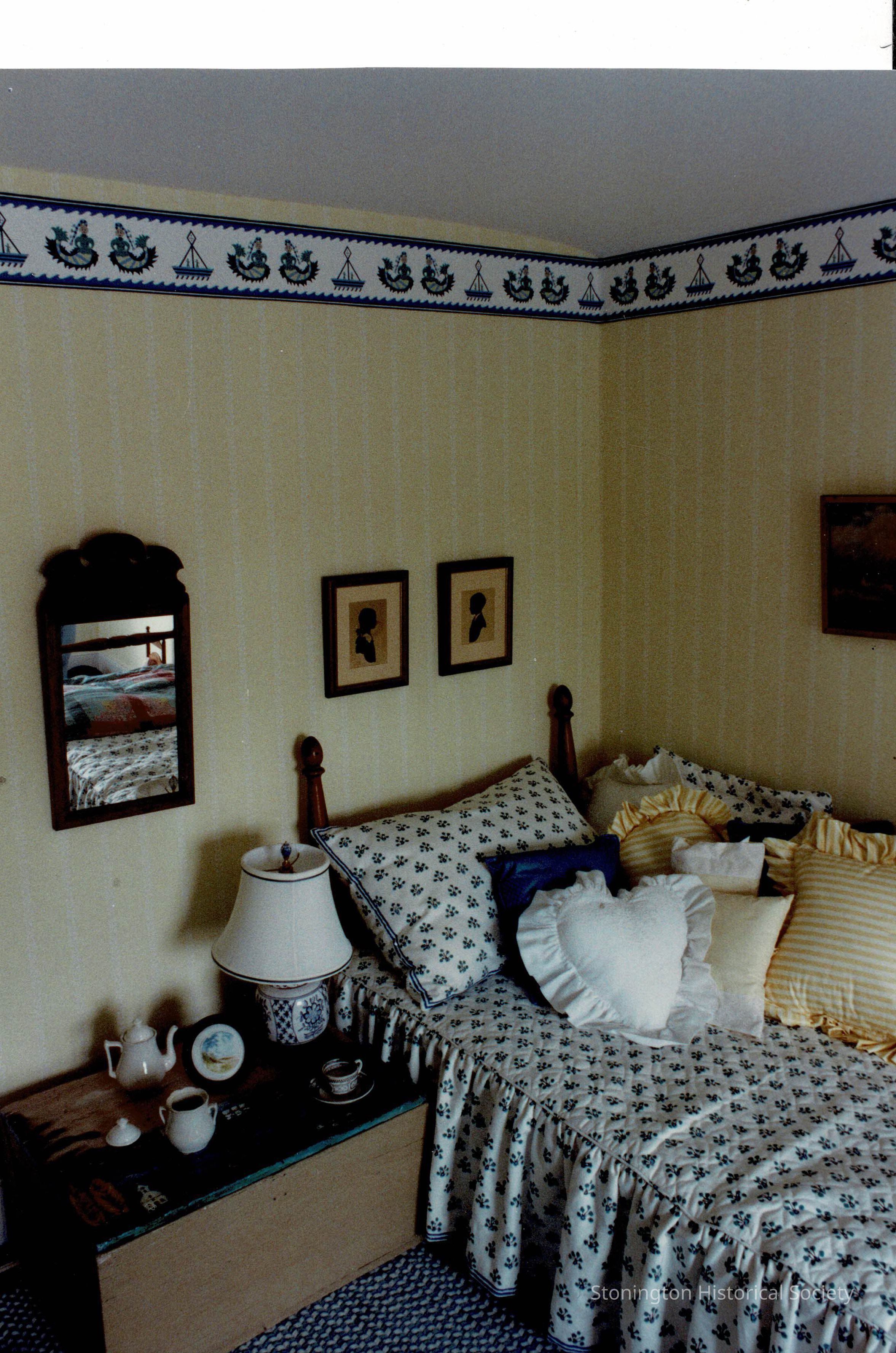 View of “Tea at the Top – A Child’s Room”, as it was decorated for the Designer’s Show House in 1989. The third floor of the Captain Nathaniel B. Palmer House served as storage for the family when the house was completed in 1852. This room held the cistern. It was reimagined in 1989 by Boxwoods Interiors of Cohasset, MA. Designed by Ellen V. White. As of 2024, the wall treatment remains the same, and this room is used to interpret toys and children's items in the museum collection.Collection