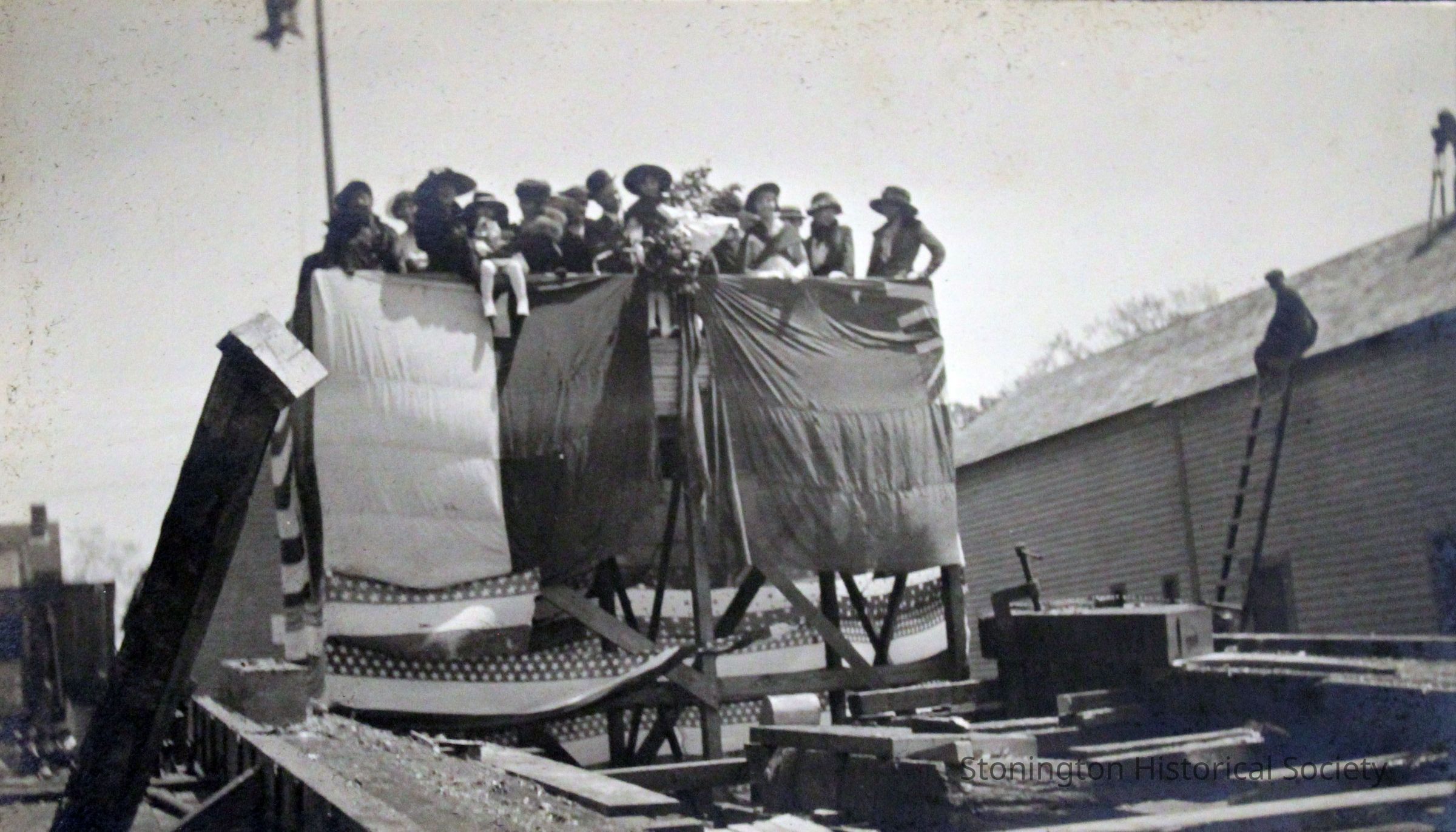 After the accidental launch of the SS Lansing, on May 20, 1919. Dignitaries, company representatives and their families arrived for the launching, only to see that the ship had slid into the water early. The group looks toward the harbor from the viewing platform. A photographer is visible on the rooftop at the far right. Despite the ship launching itself early, these photographs were probably taken for publicity for the two companies. The Lansing steamship was rebuilt by the Ship Construction and Trading Company, Inc. of Stonington for the Nafra Company of New York.Made/Created