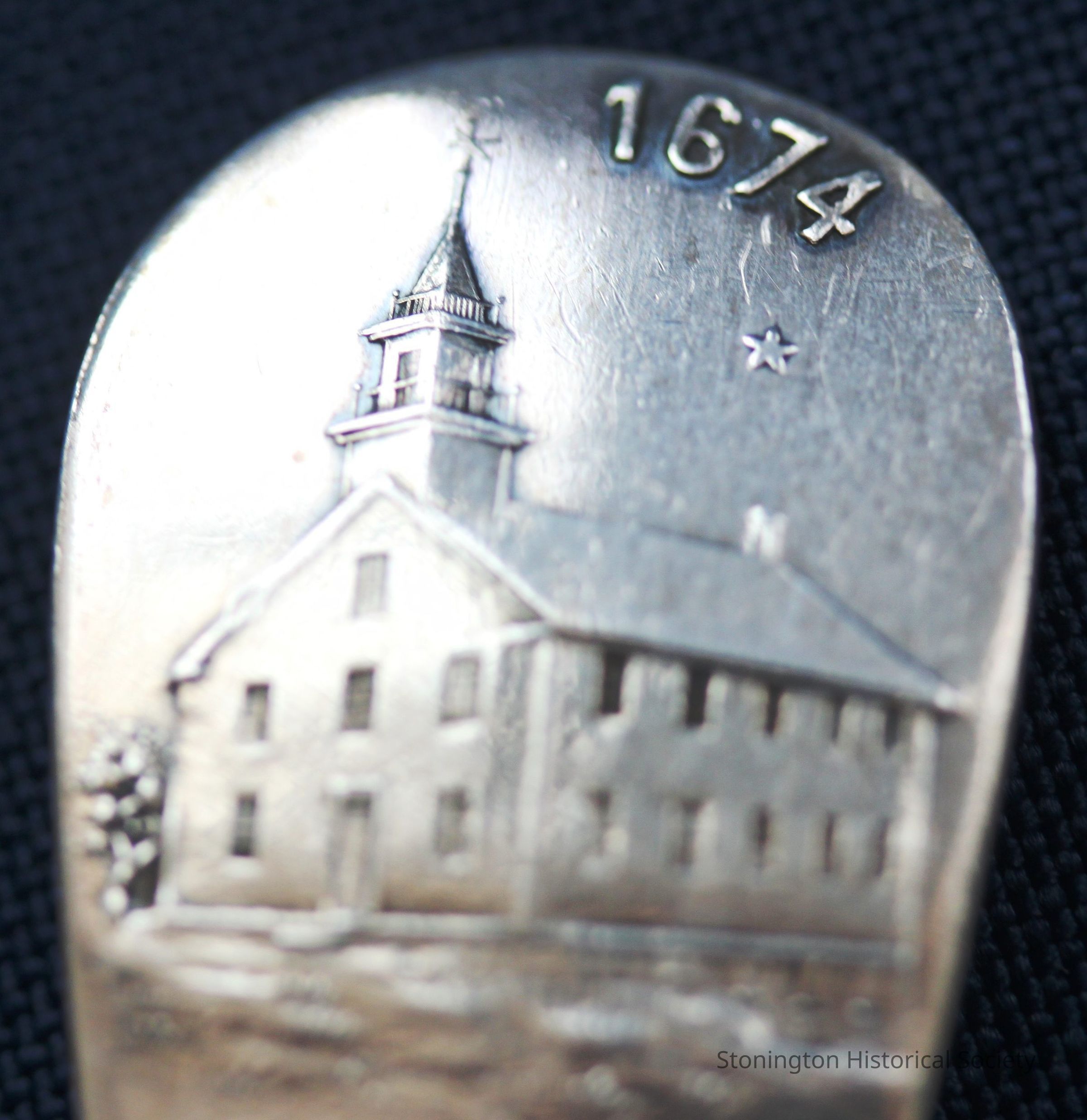 Teaspoon, Road Church Bicentennial, 1891, silver, pointed bowl . Marked on back F.S. Thompson. Makers mark is a four leaf clover? Made to raise money for the Church.