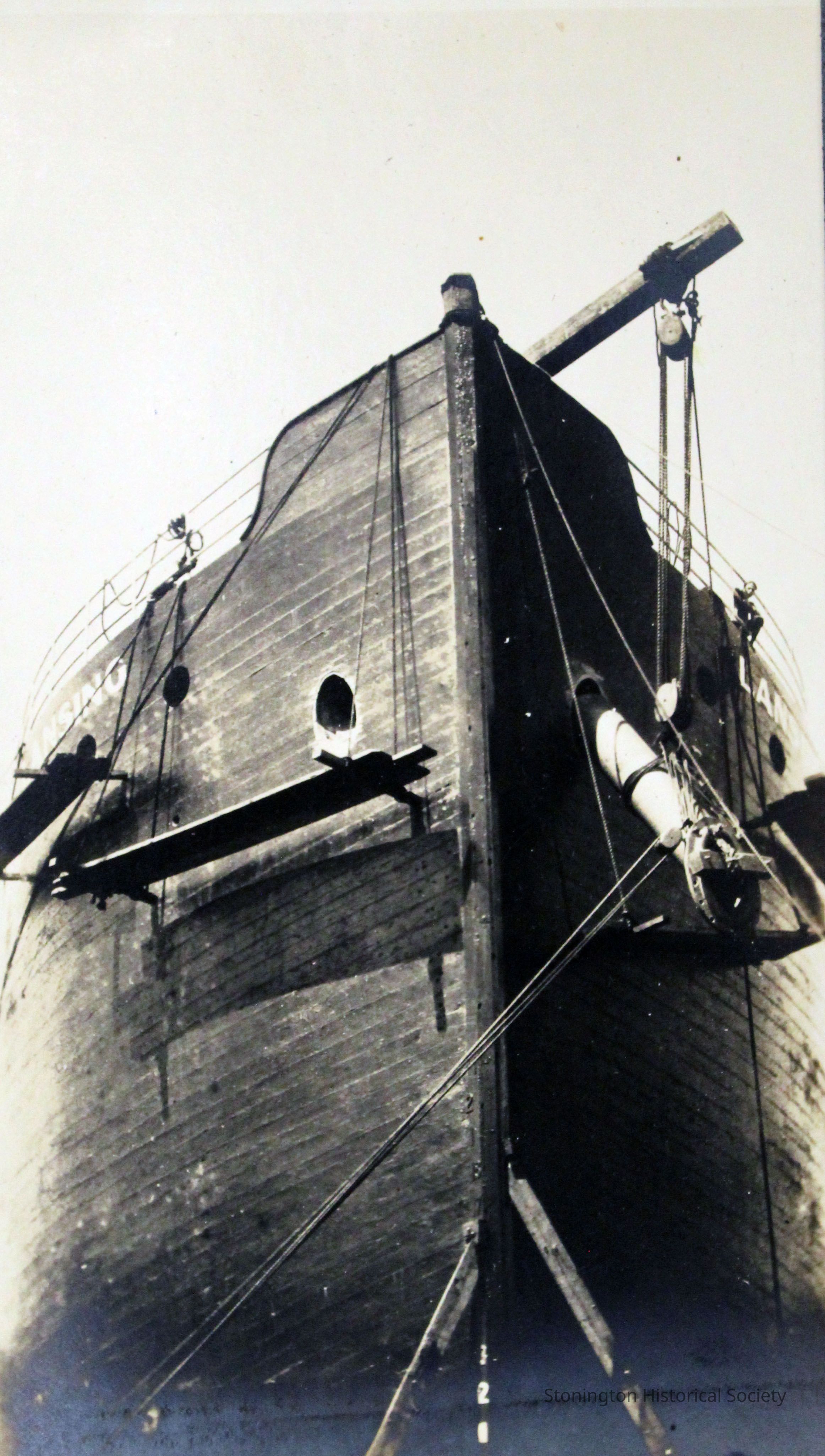 Exterior view of the bow of the nearly finished SS Lansing, spring 1919. The Lansing steamship was rebuilt by the Ship Construction and Trading Company, Inc. of Stonington for the Nafra Company of New York.Made/Created