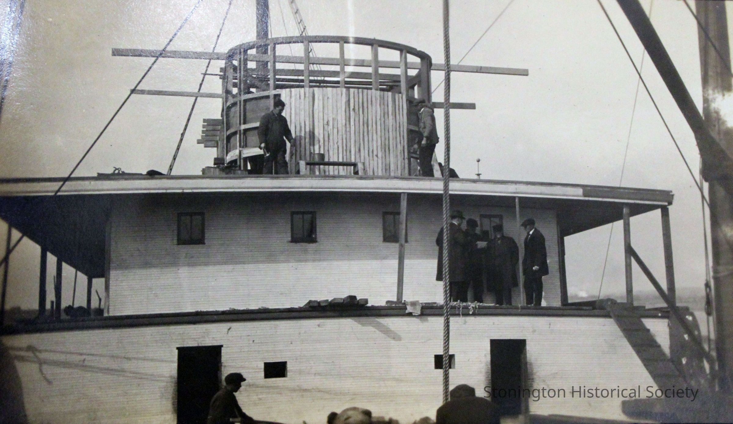 Close up view of workers building the pilot house of the SS Lansing. A group of well dressed men (possibly investors or supervisors) is gathered on the second level. Photograph most likely taken in early 1919 as the vessel was nearing completion. The Lansing steamship was rebuilt by the Ship Construction and Trading Company, Inc. of Stonington for the Nafra Company of New York.Made/Created