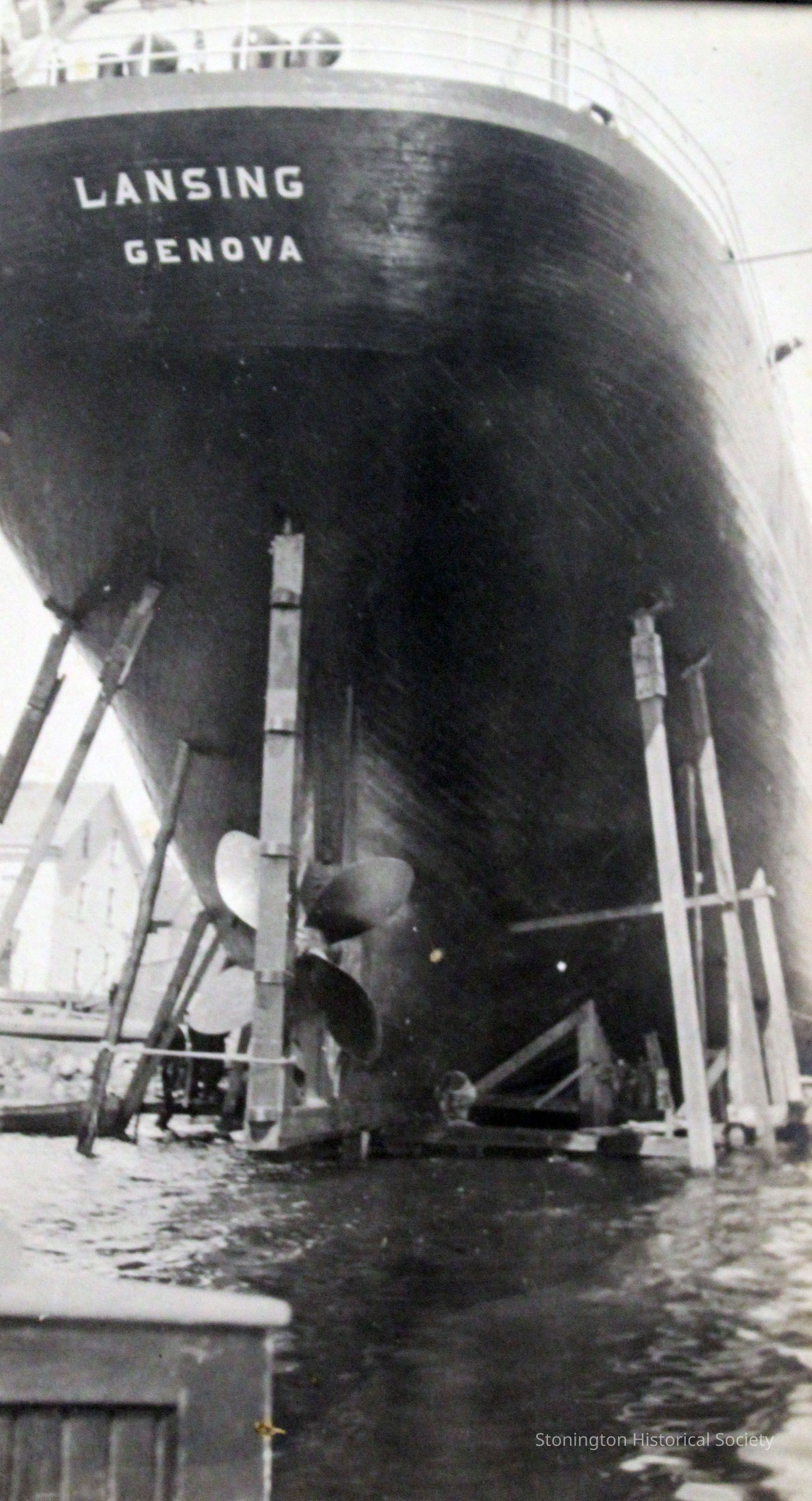 View from the water of the newly rebuilt SS Lansing at Stonington docks, spring 1919. The cradles and supports are still in place along the water line, and the propeller is visible. The Lansing steamship was rebuilt by the Ship Construction and Trading Company, Inc. of Stonington for the Nafra Company of New York.Made/Created