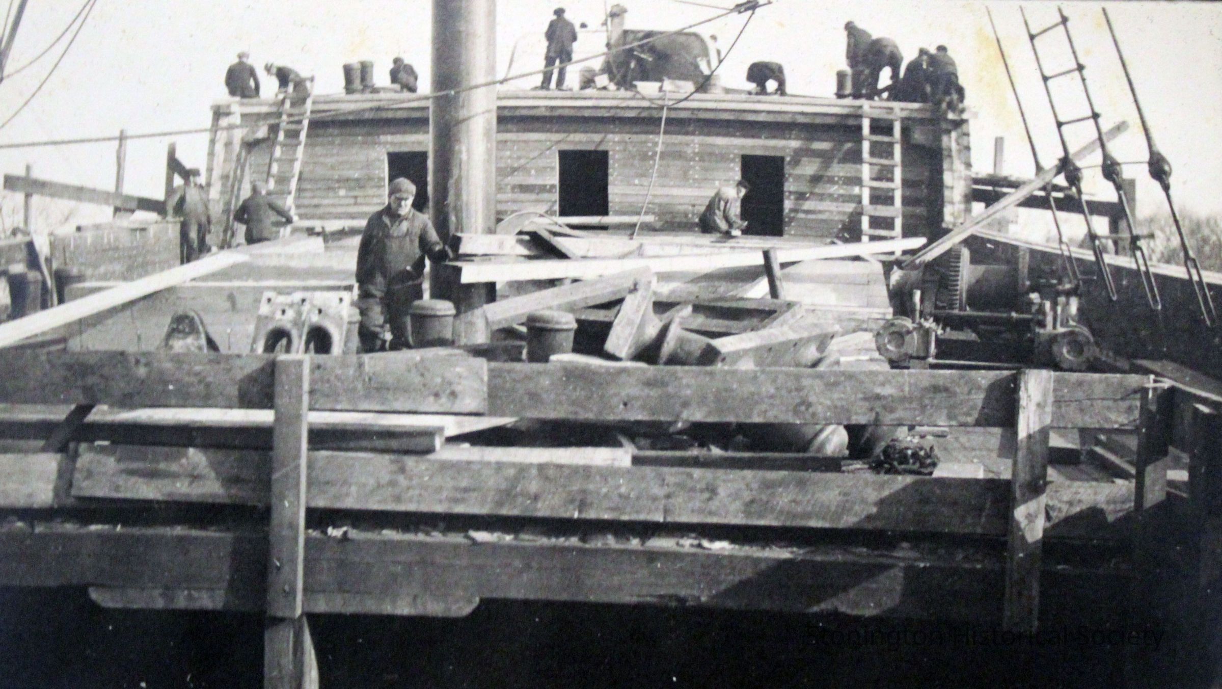 Carpenters and other workers building the upper decks of the SS Lansing. Materials and some tools are visible in the foreground. This appears to be early 1919. Structure in the back may be the pilot house. The Lansing steamship was rebuilt by the Ship Construction and Trading Company, Inc. of Stonington for the Nafra Company of New York.Made/Created