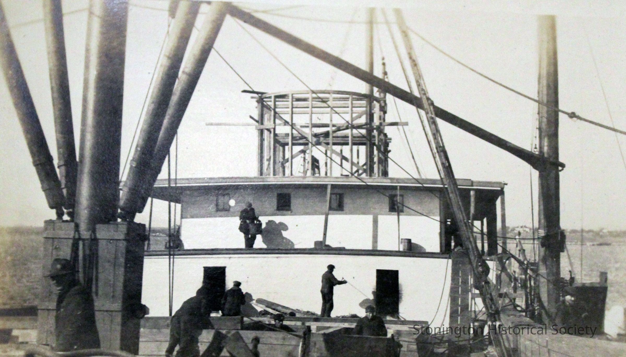 Rebuilding of the SS Lansing in Stonington, early 1919. The lower levels or base of the pilot house appear to be completed. A few workers carry buckets, or apply a coating to the exterior. Due to clothing worn by the workers, this photograph was most likely taken in early 1919. The Lansing steamship was rebuilt by the Ship Construction and Trading Company, Inc. of Stonington for the Nafra Company of New York.Made/Created
