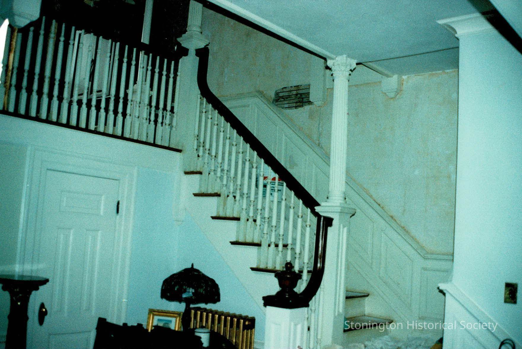 Photograph taken in July 2001 of the stairwell of Bella Vista, 166 Elm Street, by Rae and Steven Singer after purchasing the property. The home was originally built by Edward E. Bradley around 1901 and features many original architectural and ornamental details. These photographs were taken to document the state of the house before it underwent cosmetic and some interior structural renovations by the Singers. The wall coverings have been removed in preparation for new paint and/or wallpaper. Photograph printed, August 2001.Collection