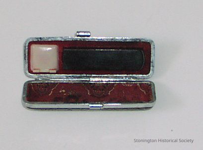 Stamp, or "Name Chops," a black hinged case holding a Chinese name stamp and carton of red ink. The inside of the case is lined with red velvet.