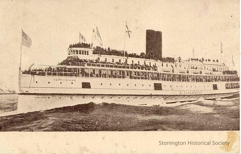 Steamer "City of Lowell" of the Norwich Line underway with crowded decks. This is "b&w" version of 2002.0613.569