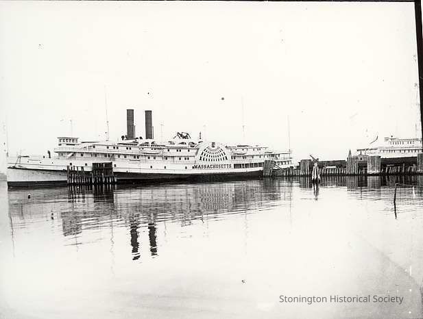 Steamer MASSACHUSETTS at dock MLG-253 has print and negative in section of book titled "Boats, Steamer, Harbor, Breakwater"