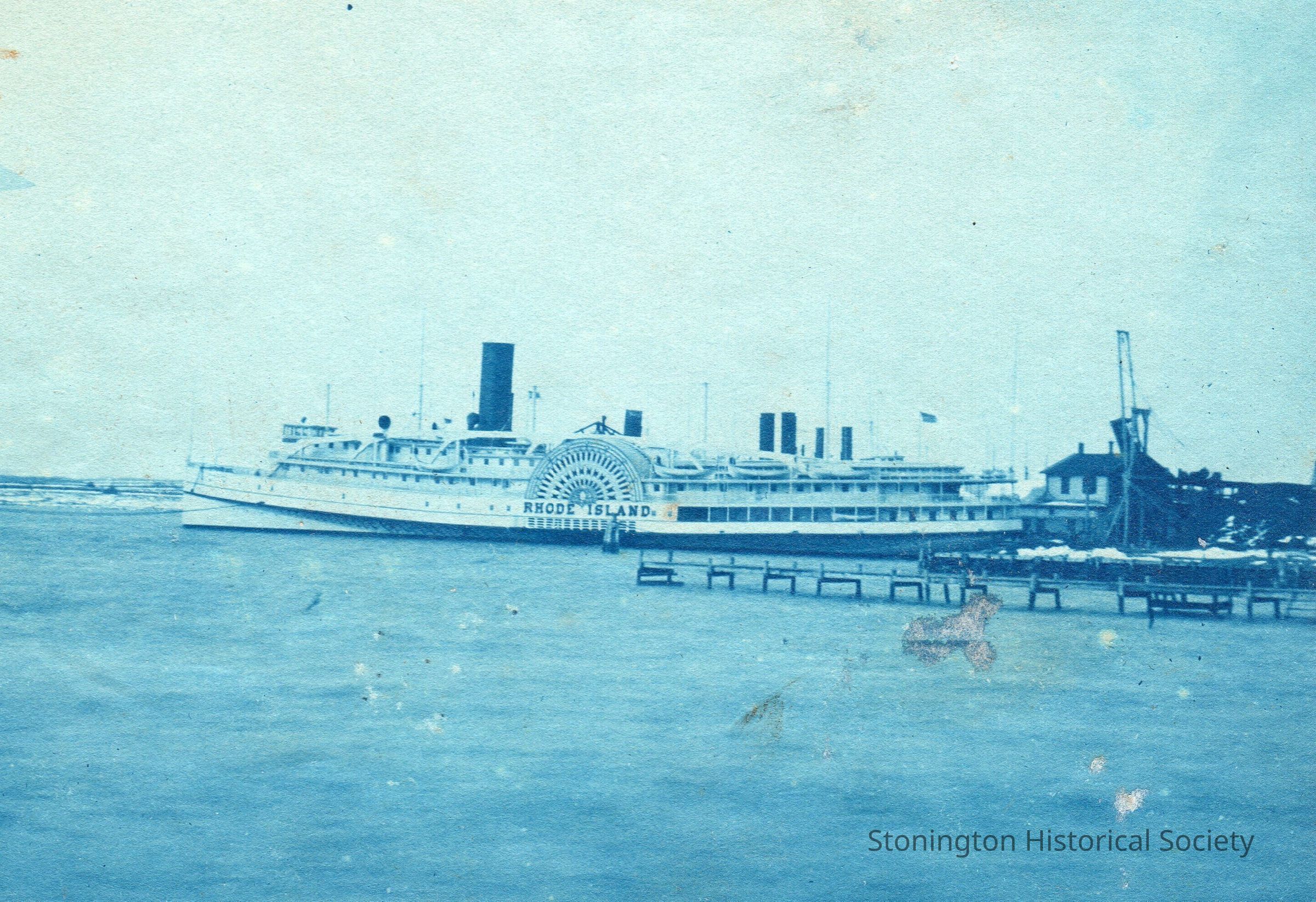 Photograph from the Harry Northup album (2015.019.002), cyanotype with enlarged print. Caption from Harry Northrup: "This picture of the steamer RHODE ISLAND tied up on the south side of Steam Boat Dock, in the Borough. She was one of the vessels that ran on the Stonington Line. The CONNECTICUT, VERMONT, MAINE and NEW HAMPSHIRE were the other vessels in the fleet."Collection