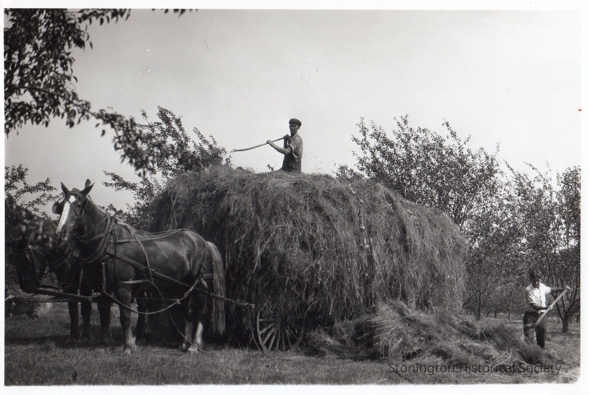 Haying at Stone Acres Farm, Stonington, c. 1920. At this time the farm was owned by Dr. Eugene Phelps Edwards.