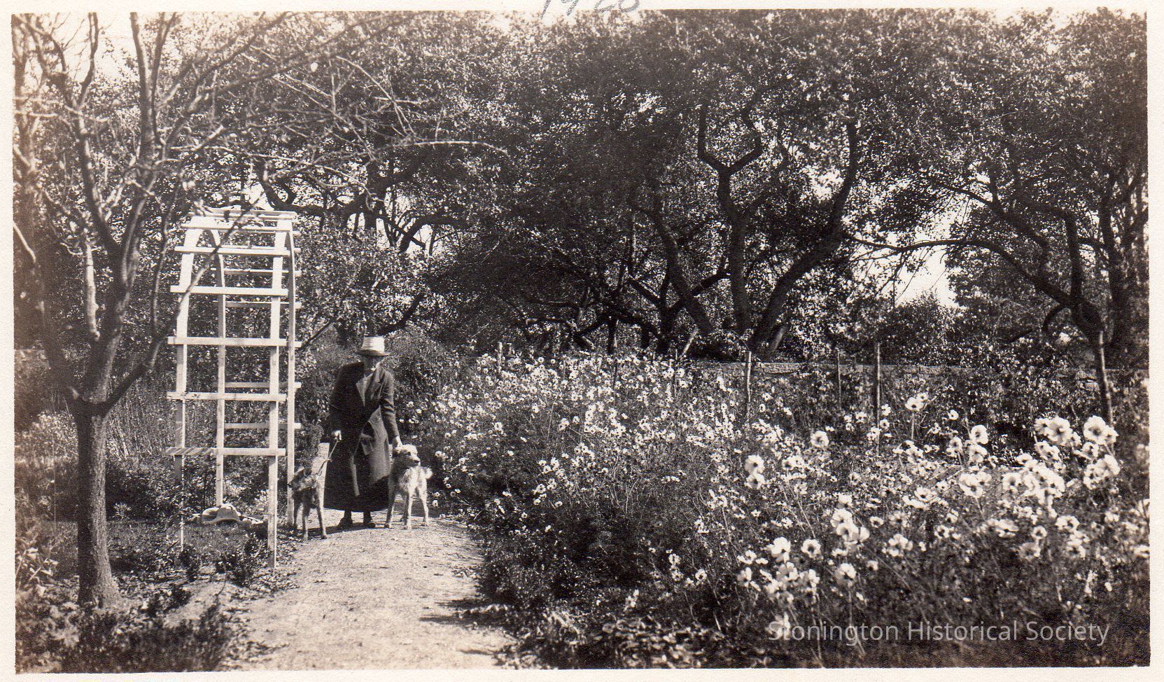 Black and white photograph of Eliza "Lila" Adams Edwards with a dog in the gardens at Stone Acres, c. 1920