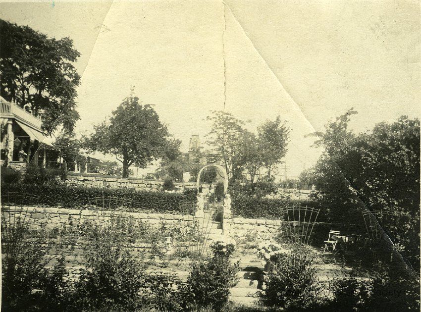 Stone wall, steps and angels in garden at "The Hill," residence at 35 Grand Street has negative