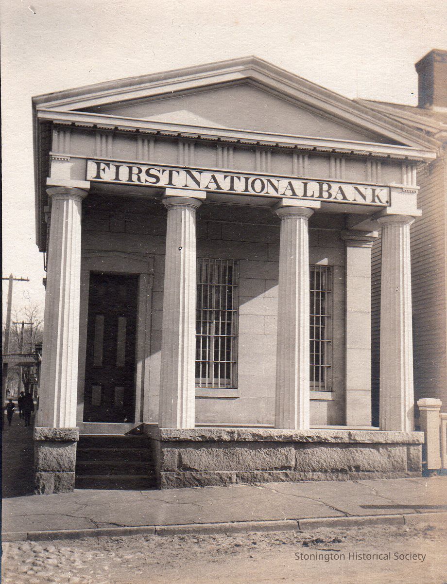 Black and white snapshot of the First National Bank of Stonington, early 1900s.