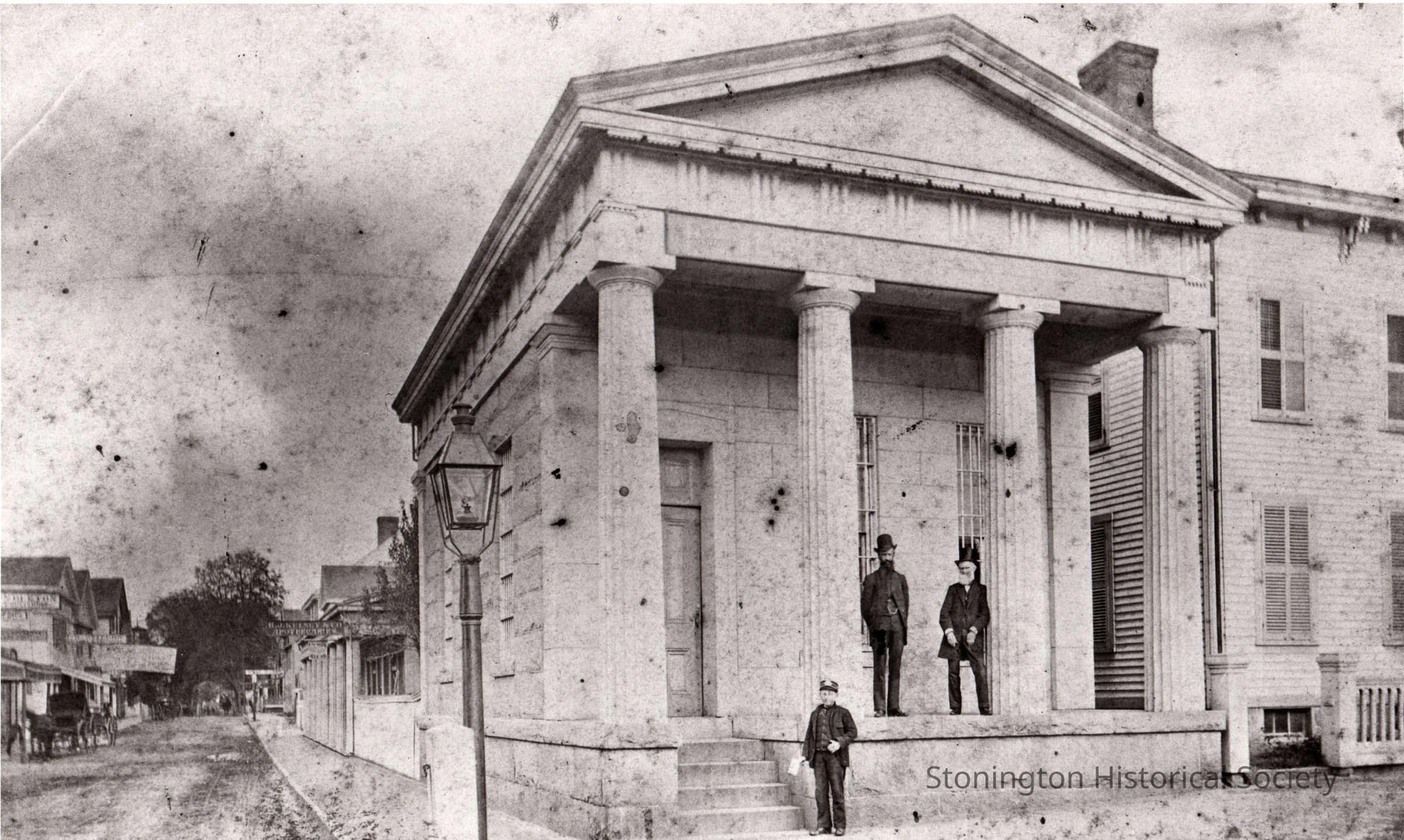 black and white photograph (2 copies) of three men standing in front of the Stonington Bank, c. 1880