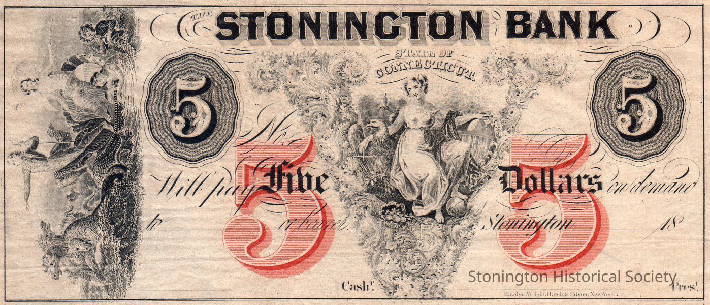 Collection of 6 bank notes from the Stonington Bank - one 1 dollar, four 5 dollars and one 10 dollar. One on the 5 dollar notes is issued to William Hyde Jr., January 1845. The others are undated.