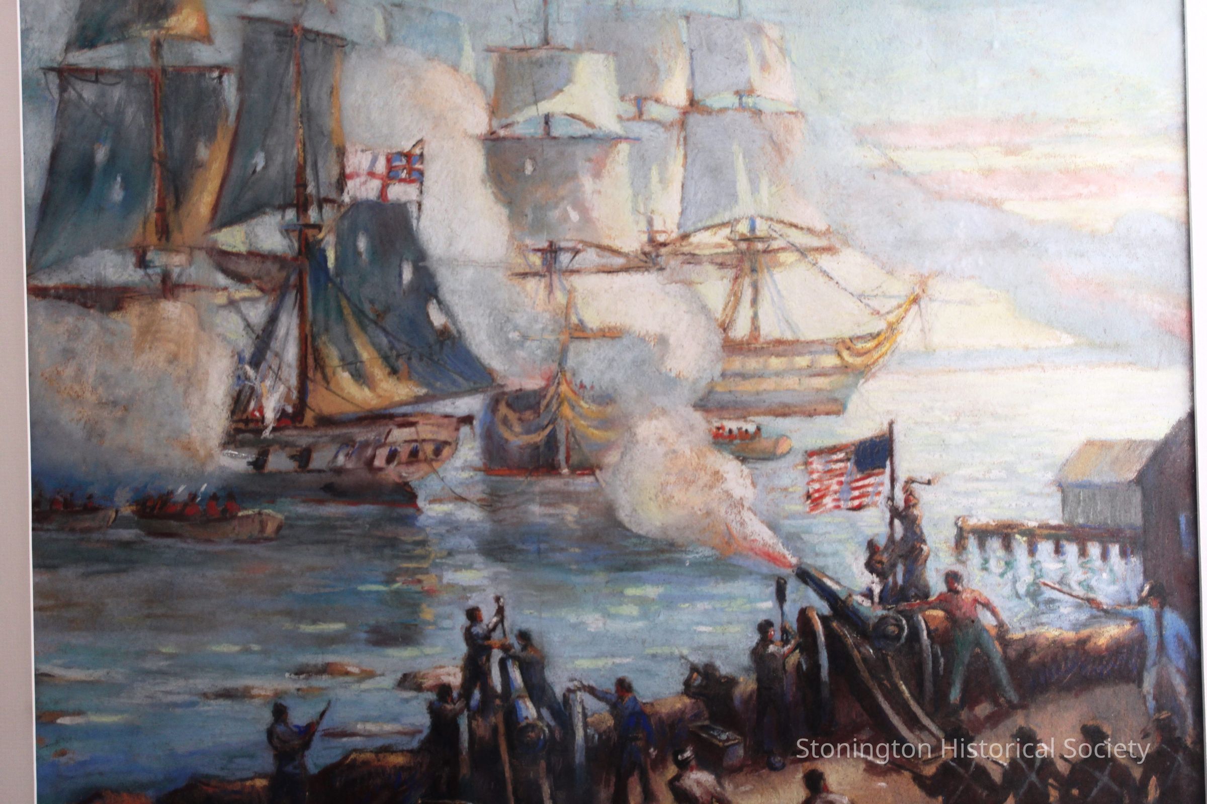 by George Bertrand Mitchell (1872-1966) . Mitchell died in Mystic, CT. He donated painting to Marine Historical Associaiton in 1944: "Heroic Stonington" which also depicts a battle scene. large-scale oil by Mitchell of the Battle of Stonington, in Mystic Seaport collection. 1944.285.Collection