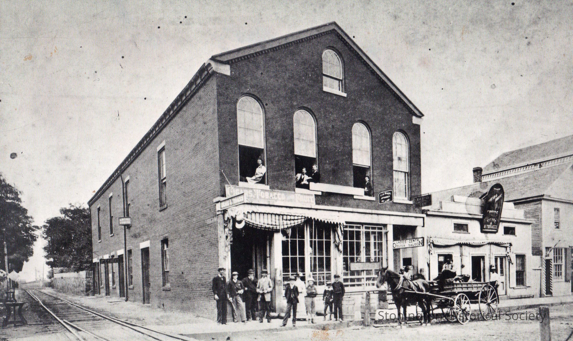 Black and white photograph of general store (selling fruit, cigars and tobacco) off the railroad tracks in Stonington Borough. Handwritten on back: "Peaceable Kingdom, Roland's Market." Photo belonged to Henry R. Palmer, Jr.