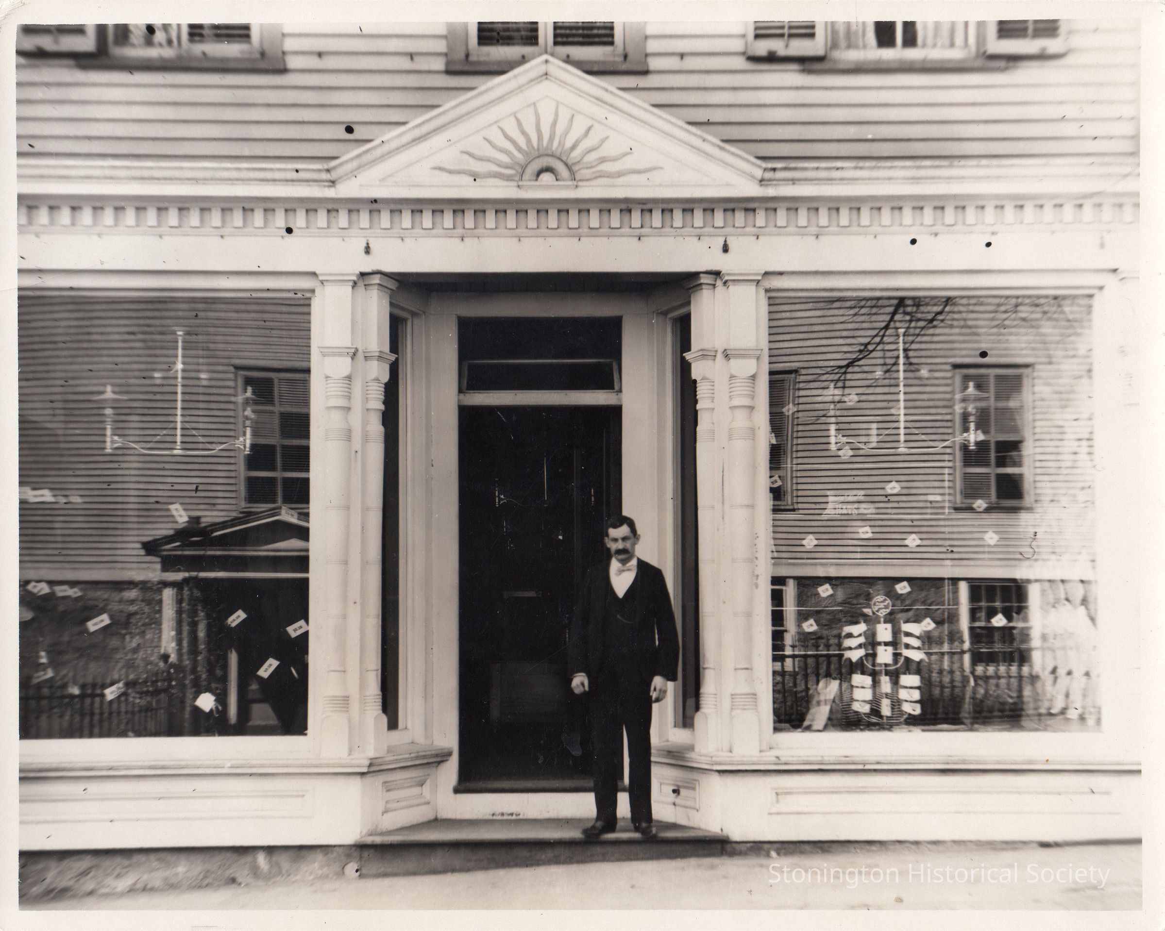 Black and white photograph of Leonard Grover in front of his emporium, Stonington Borough, April 1897. Photo belonged to Henry R. Palmer, Jr.