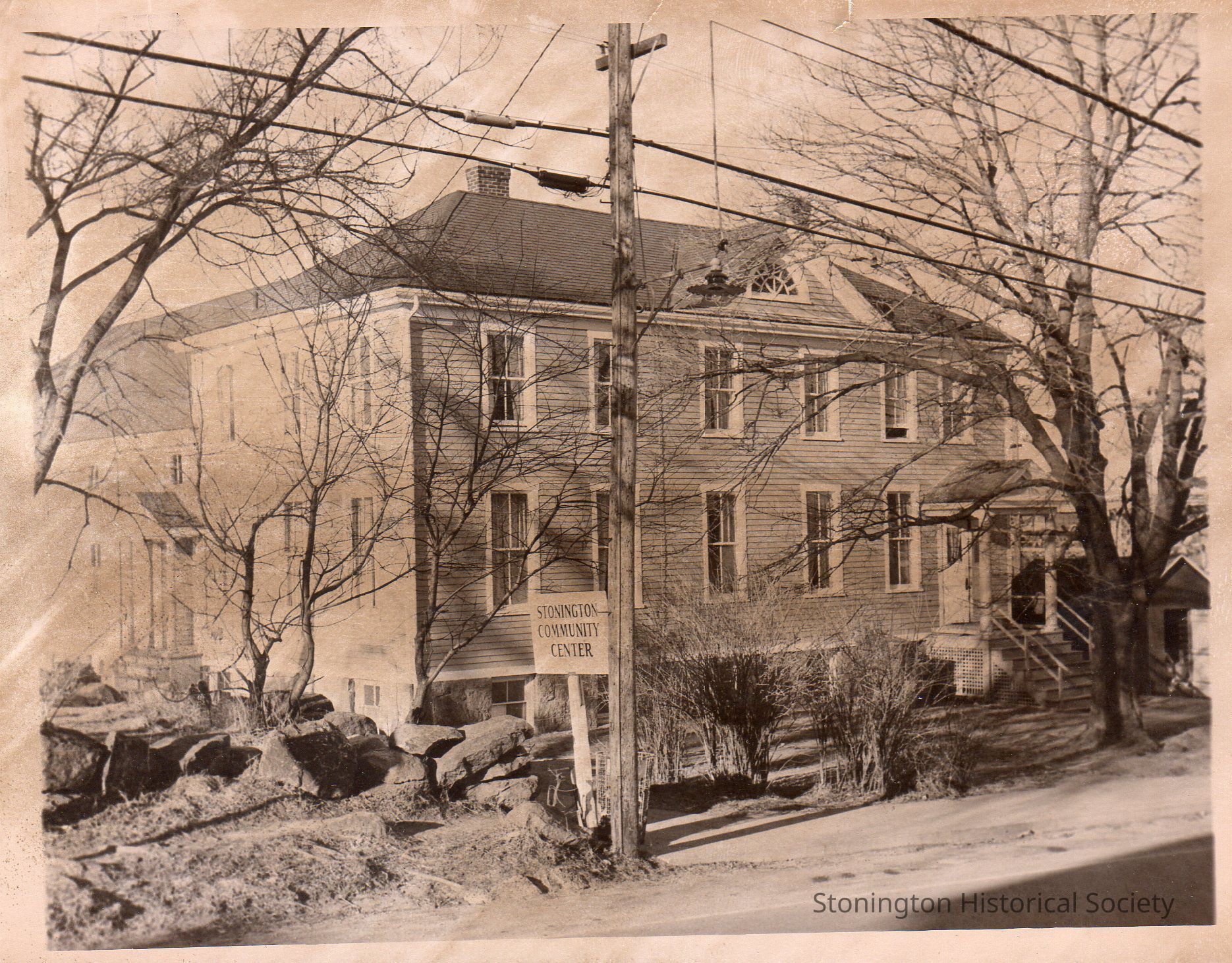 Sepia photograph of the Stonington Community Center, 1962. Published in The Westerly Sun, February 6, 1962. In envelope with negative and original news clipping.