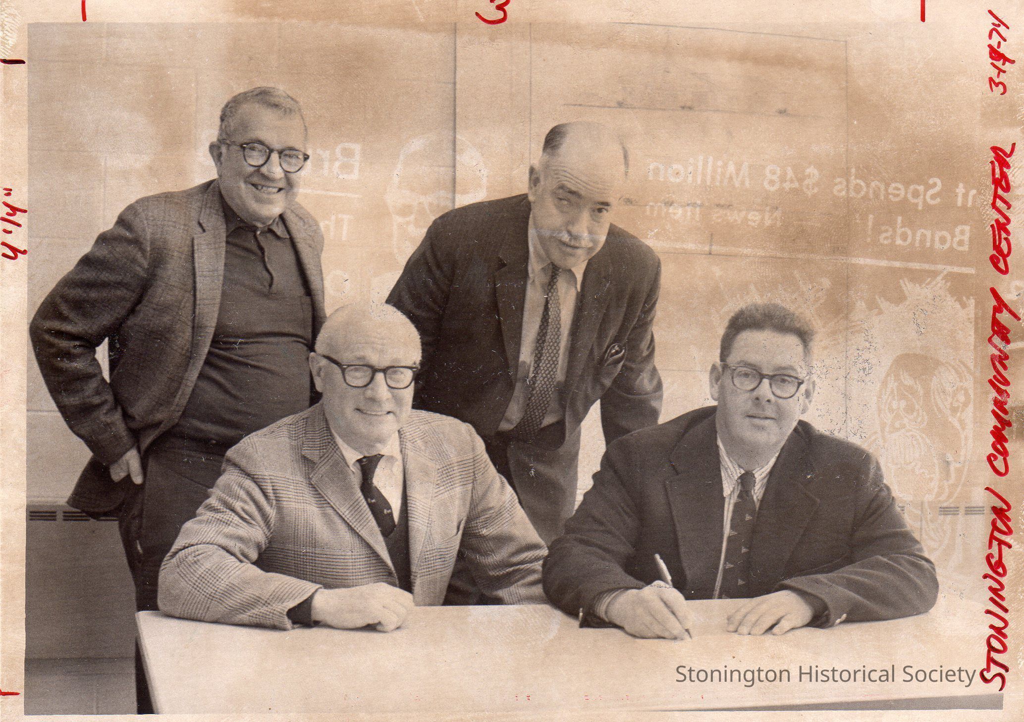 Photograph, seated (l-r): Henry J. Cragan ( Como vice president), Richard W. Woolworth (Como president), and standing (l-r): Frank Turek (Como director), Victor T. Boatwright (chairman of the building committee), March 1974. Woolworth is signing papers to complete to purchase of the Stonington Yacht Sales property, which the Como planned to use for the thrift shop, pottery and art classes/studios, furniture refinishing and storage for the Village Fair, Antiques Show and Stonington Players. In envelope with accompanying news clipping and negative.