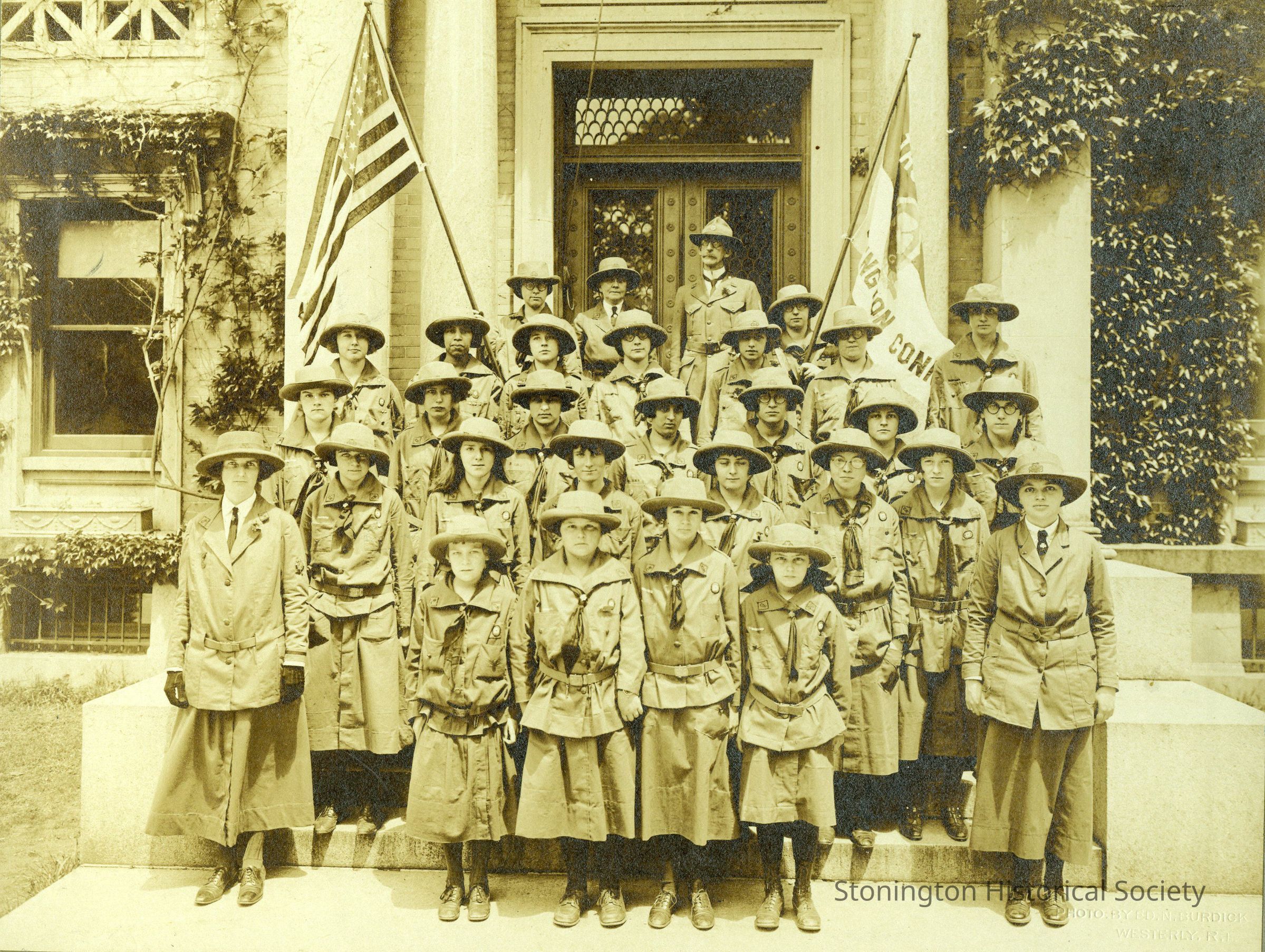 5 black and white portraits of Stonington girl scout troops, 3 copies of troop I, May 30, 1924, and two copies (different images of the same group) of troop I, undated (photographed by H.B. Harvey, Stonington, CT)