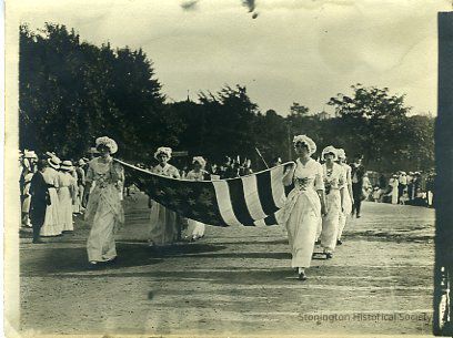Stonington girls carrying American flag. These are two photographs, one has some smudges on it.