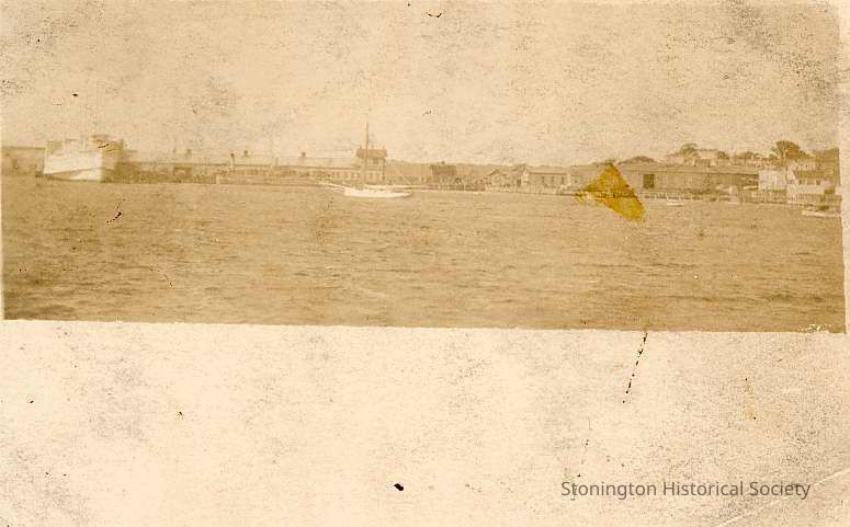 Postcard of Stonington Harbor looking north with vessels. Typed note included naming ships - "Dismantled 'City of Worcester' at extreme left. Wayland yacht 'Viola' in center. Old round-house at extreme right."
