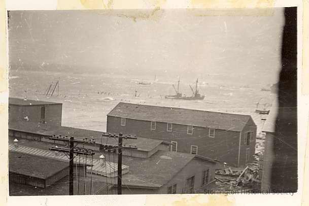 Photo taken during 1938 hurricane of harbor with ships from Atwood Machine Shop