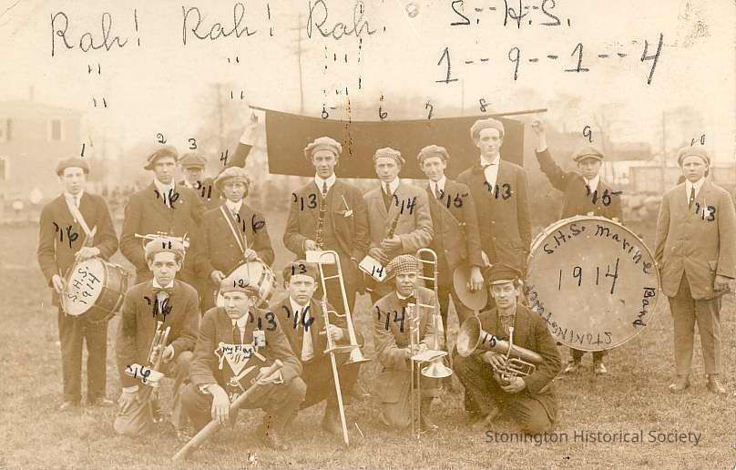 Stonington Marine Band in 1914 assembled for the Westerly-Stonington game. Participants listed by name and number on reverse.