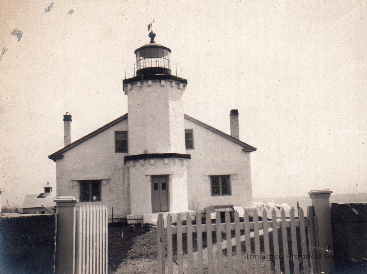 Black and white snapshot of the Stonington Lighthouse, photographed from Water Street, early 1900s.