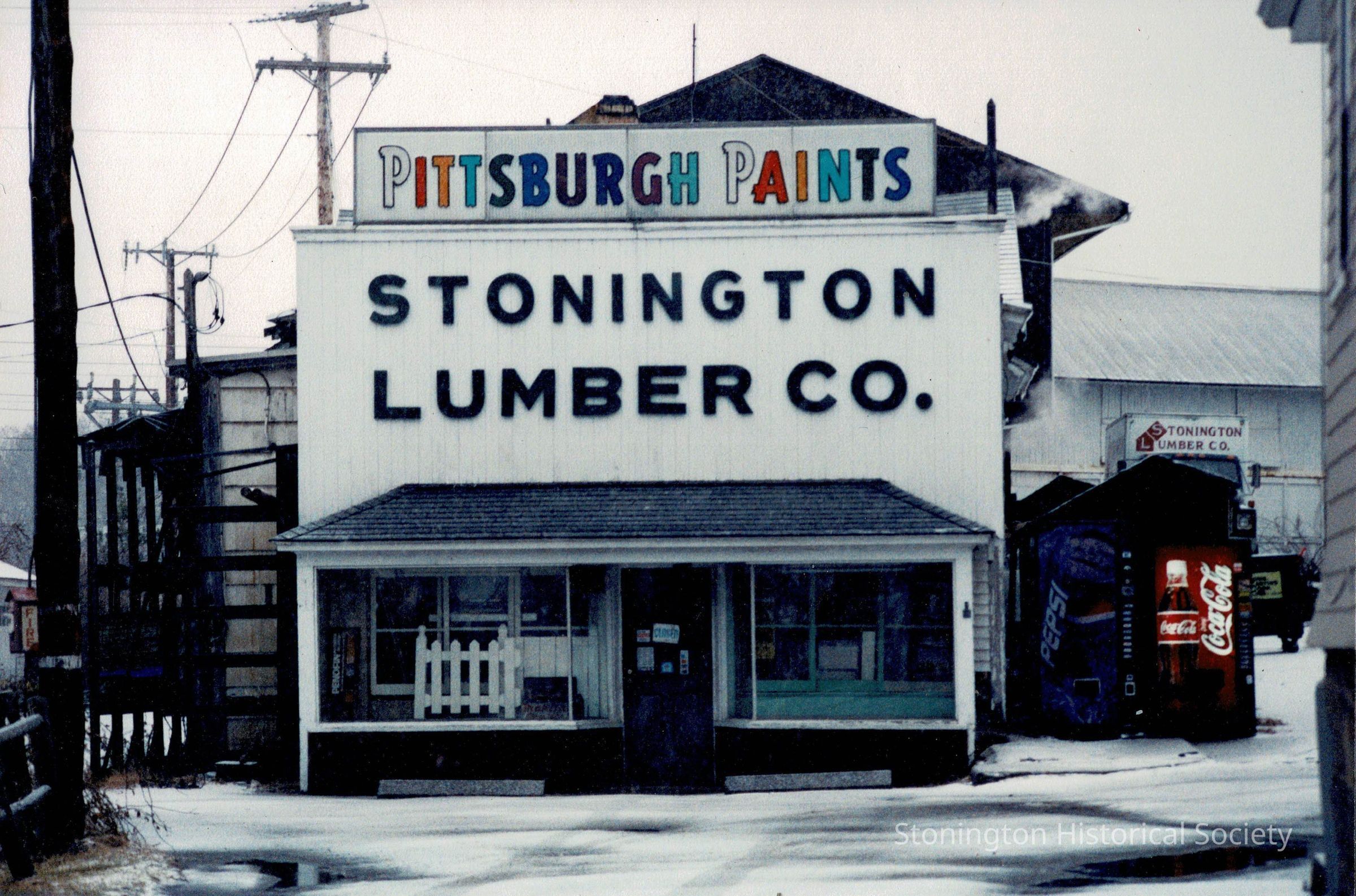 Color photograph of Stonington Lumber Company, adjacent to 101 Main Street in Stonington Borough. The company was started in 1929 by Andrew Wheaton Perry (1867-1948) and his son, Burrows Perry (1897-1990), as an off-shoot of their construction company, A.W. Perry & Son. The company remained in the family, ultimately being run by Andy Perry, the son of Burrows Perry until it was finally sold and demolished in 2006.Collection