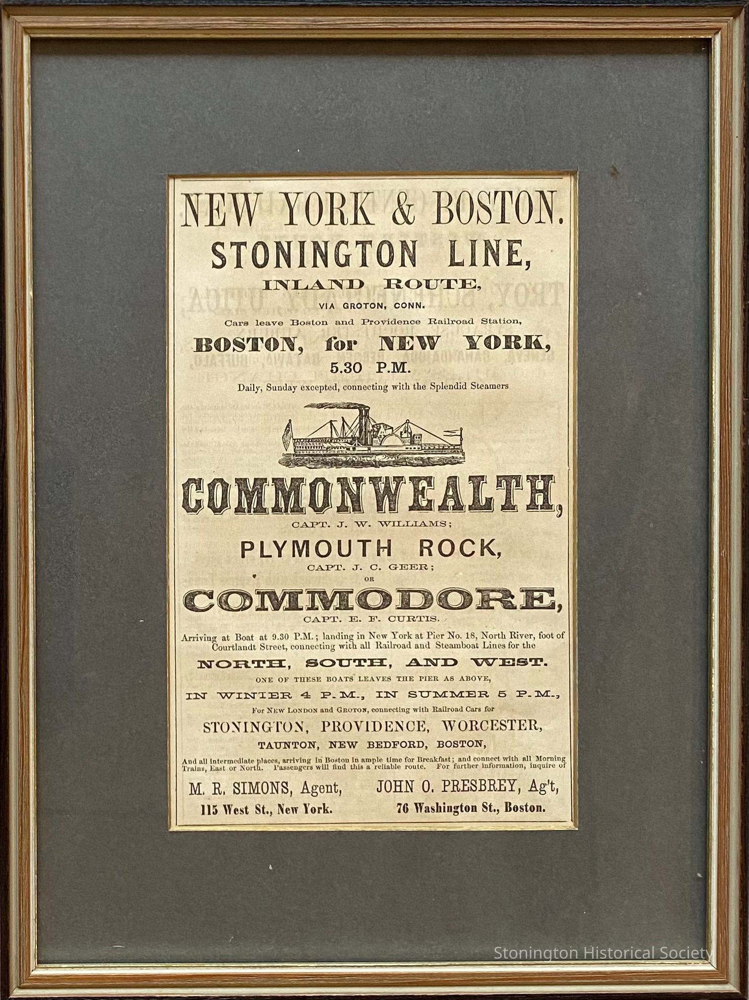 Advertisement for the New York, Boston & Stonington Railroad Line and Steamers COMMONWEALTH and COMMODORE. Frame removed for storage.