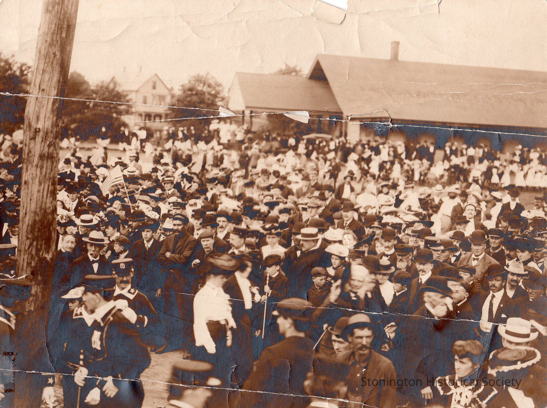Black and white photograph of a crowd at the Stonington Railroad Station, c. 1915.