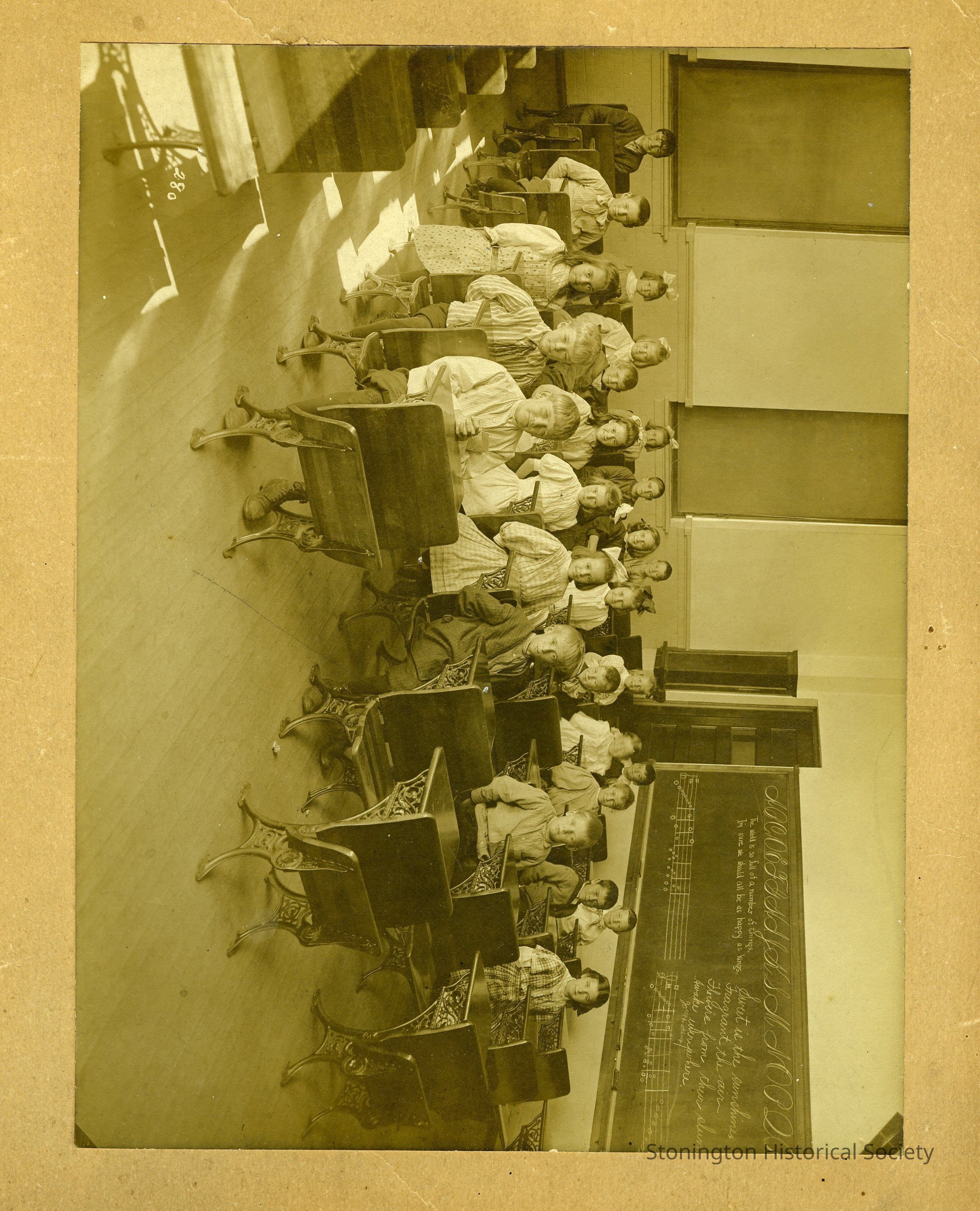 Group of seven photographs and postcard of Stonington School in the borough with children and teachers (2 unidentified buildings). Some are in poor condition. Originally these photos belonged to Harriet Bessette who gave them to donor's husband who had worked at the school, possibly during renovations.Collection