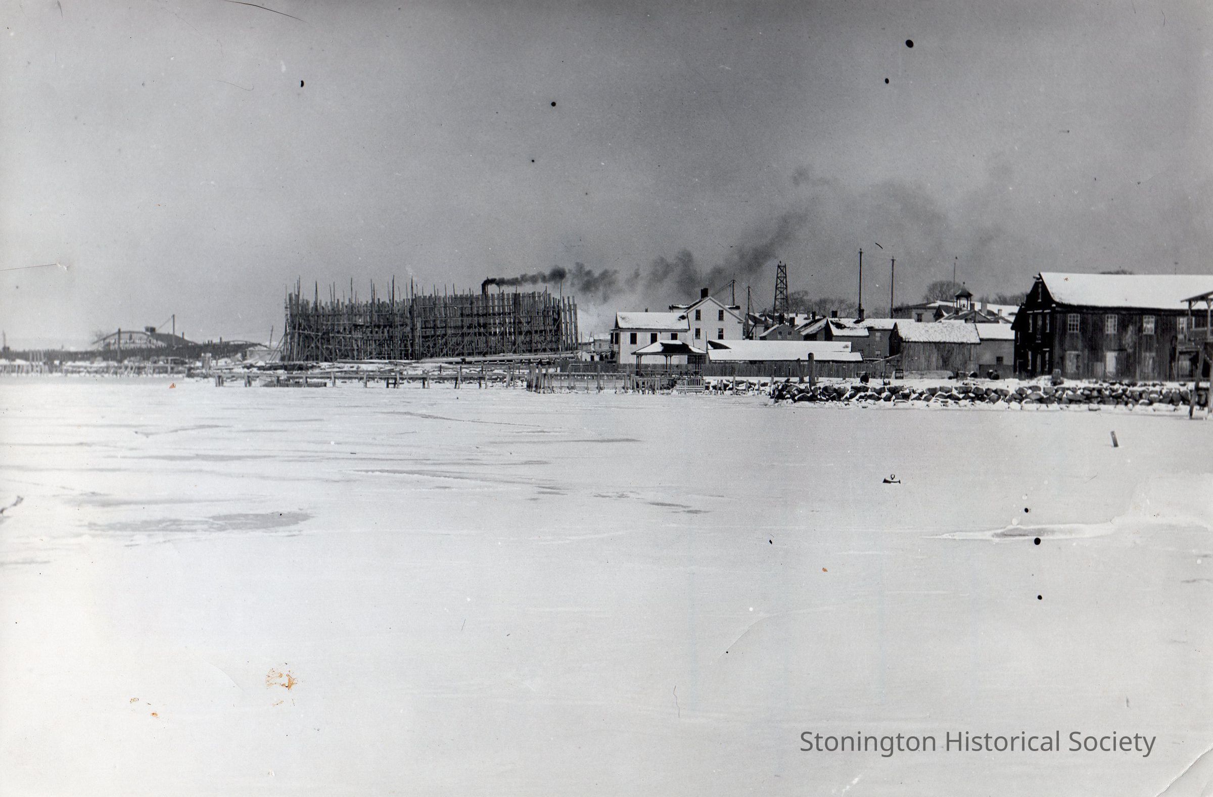 Black and white photograph of the ALTURA and ASHLAND under construction at the Stonington Shipyard, winter 1917. Label on back reads: "These ships were built entirely of wood, for metal was in short supply and carpenters were more plentiful than iron workers. None were completed in time to help the war effort. LANSING finally left Stonington on August 19th and served in the Mediterranean for a couple of years carrying general cargo, then disappeared from the records. ALTURA was launched March 15, 1919 and saw limited service. ASHLAND followed three months later, her superstructure removed, her role altered by the course of war to a barge for carrying coal." Photo belonged to Henry R. Palmer, Jr.