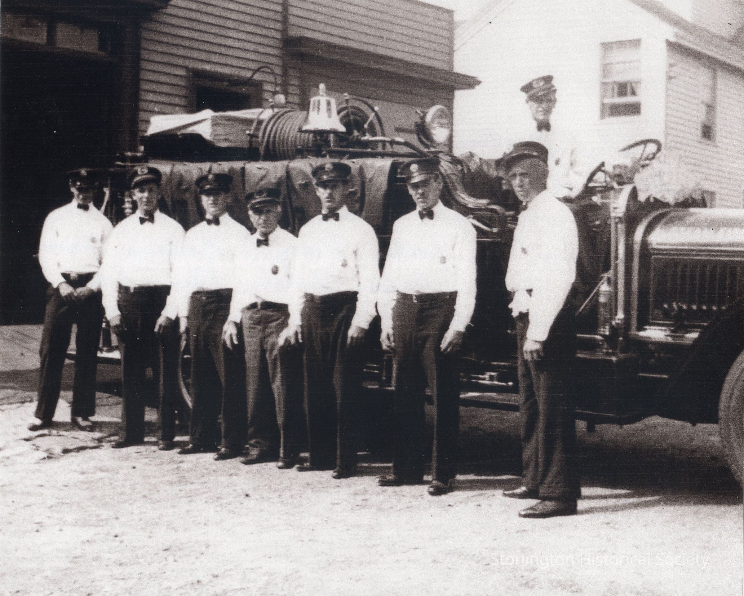 Black and white copy print, members of the Stonington Steam Fire Engine Co. #1, c. 1938. Given to the Society by Harry Northup before his death. With note: "This picture was taken about 1938 in front of the old Firehouse in Stonington, CT. It shows John D'Amico, his six sons and his son-in-law, my father Harry A. Northup. From the left, Eugene, Alden, Charlie, Grandfather John D'Amico, his eldest son John Jr., Eddie, Clifford in the truck and Harry A. Northup. They all belonged to the Steam Fire Engine Co. #1."Collection