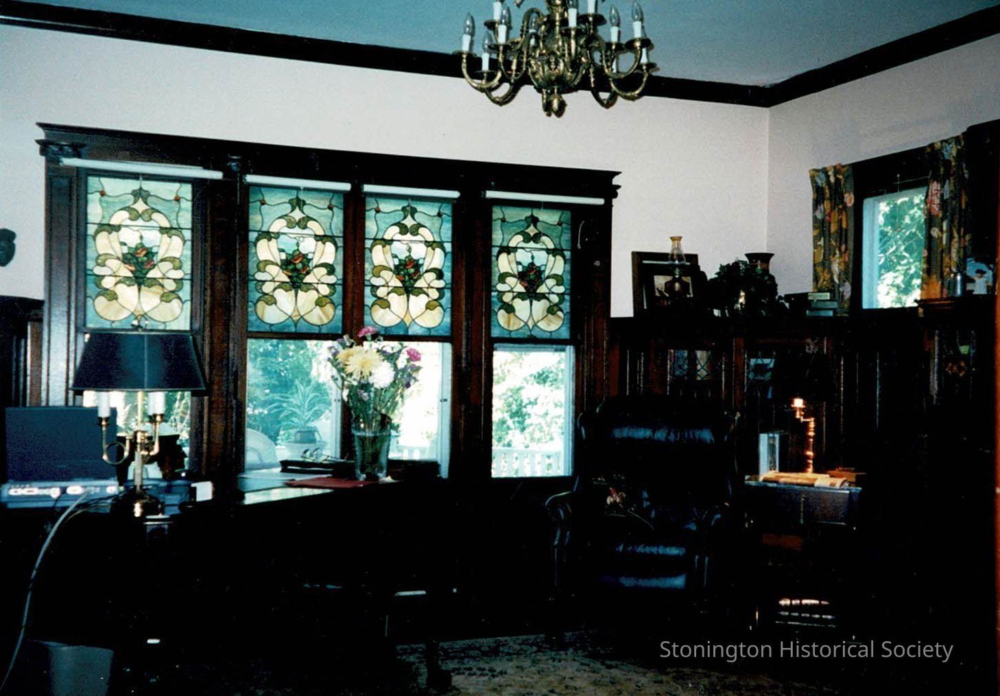 Photograph taken in July of 2000 of the study in Bella Vista, 166 Elm Street, by Rae and Steven Singer after purchasing the property. The home was originally built by Edward E. Bradley around 1901 and features many original architectural and ornamental details. These photographs were taken to document the state of the house before it underwent cosmetic and some structural renovations by the Singers. The stained glass in the upper sashes of the windows is original to the house, as are the built-ins.Collection