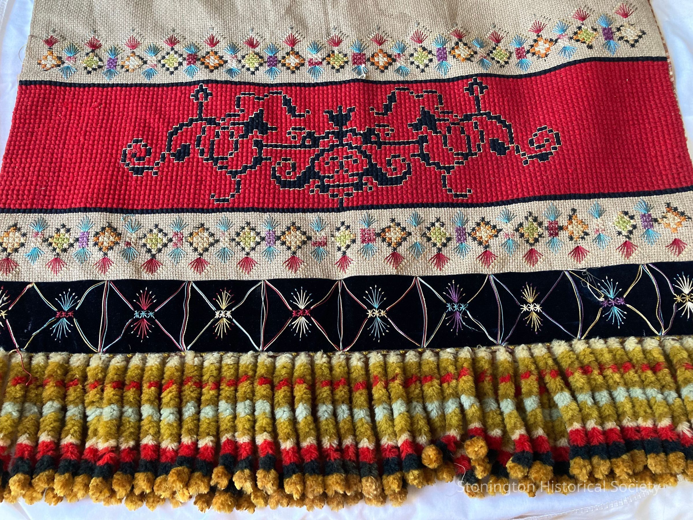 4 inch fringe of chenille; yellow,black, red and gray at each end
