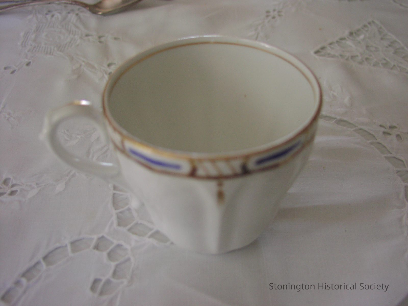 White teacup with a design of gold luster stripes that run the outer perimeter with shorter blue stripes in between.