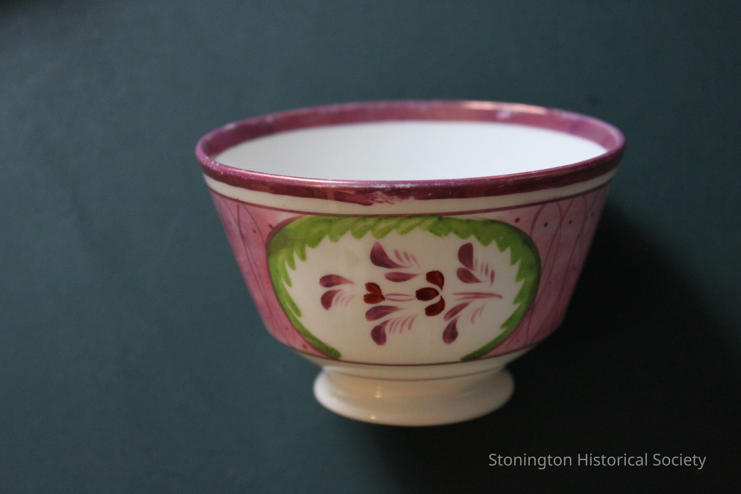 Pink Lusterware (w/green) teacups without handles. Total of 3 teacups, labeled A through C.