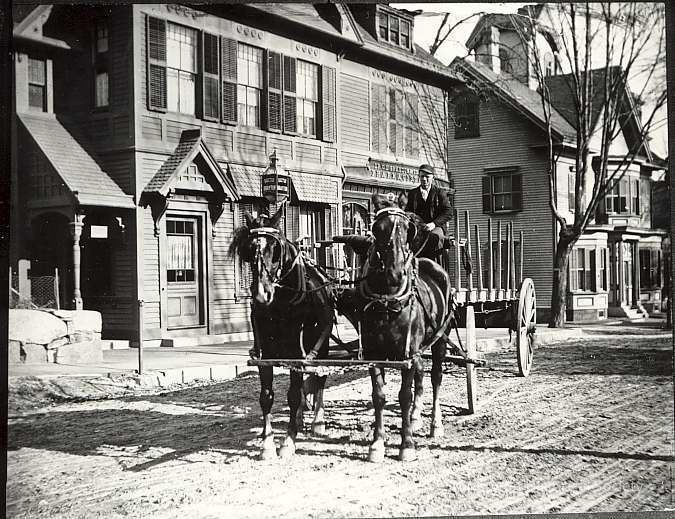 Team of horses and cart outside of Braytons Pharmacy. Corner of High Street and Main Street. Moses Pendleton. House in background