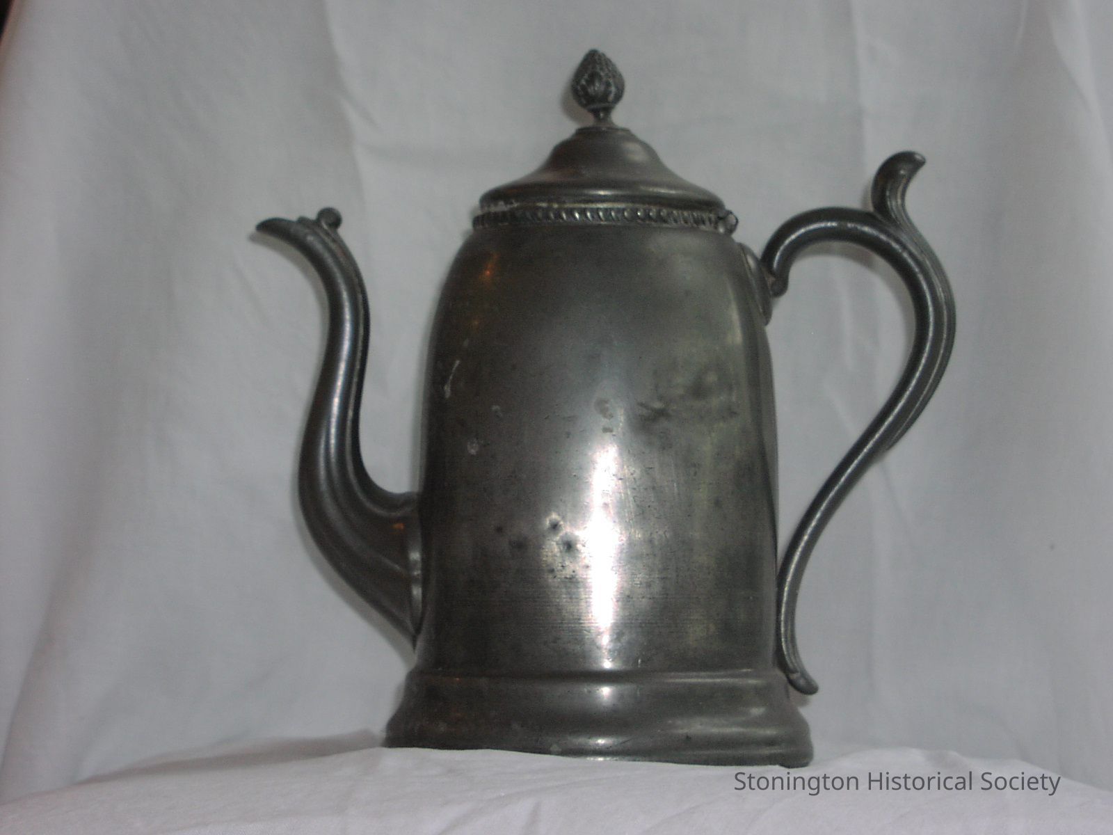 Teapot, pewter, plain Teapot has decorative top-grape cluster, circular lid