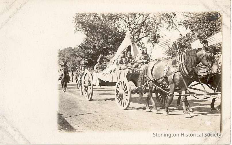 Float with teepee on Water Street during Celebration of the Battle of Stonington, 1914. Possibly same float that is listed as object 2002.0613.394.