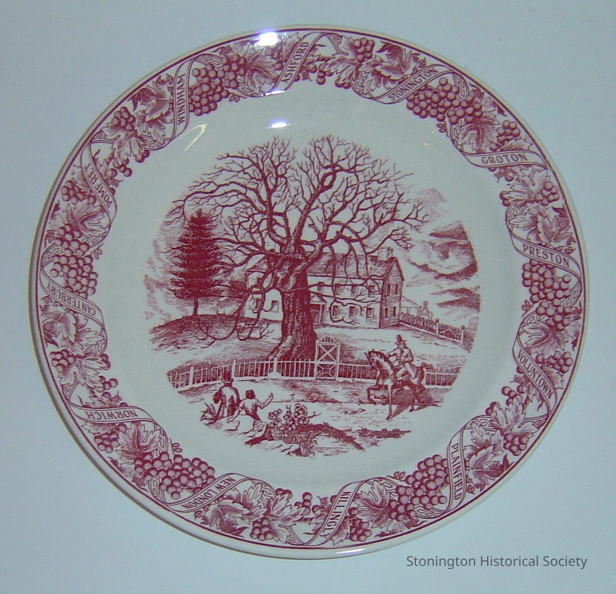 CT tercentiary dinner plate, red & white, Wyllys Mansion and the Charter Oak, designed by Frederick Dunn